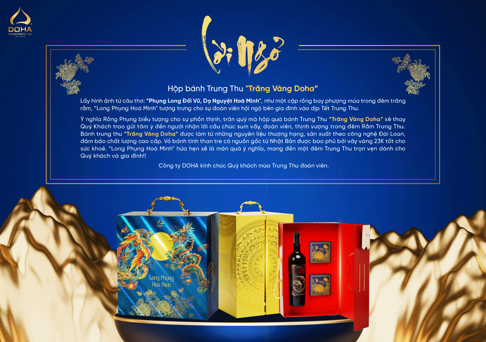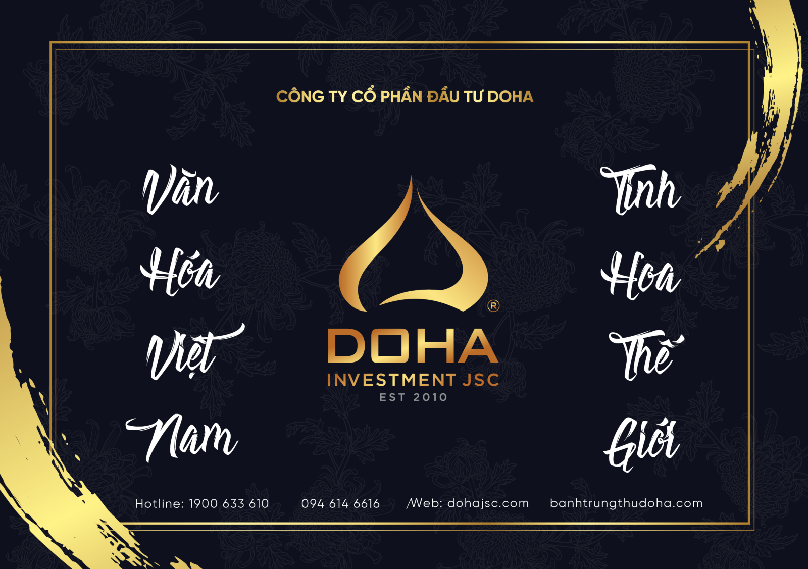 - Công ty Cổ phần đầu tư Doha ra mắt Catalogue với các sản phẩm bánh trung thu dát vàng mang nhiều thông điệp ý nghĩa trọn vẹn để đánh dấu những chặng đường với nhiều sự kiện trong một năm vừa qua và hân hoan cùng đón chào những sự kiện mới với nhiều thành công.
