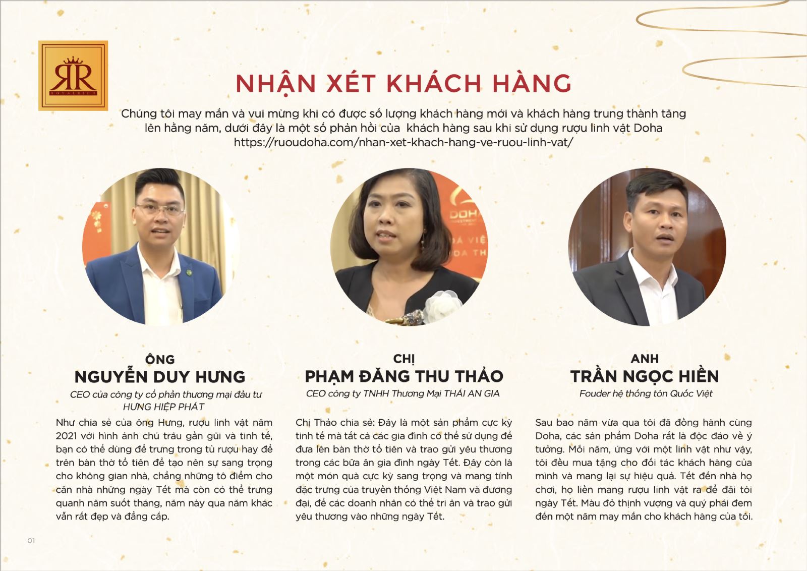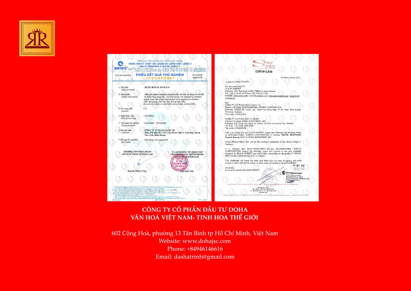 - Công ty Cổ phần đầu tư Doha ra mắt Catalogue với các sản phẩm quà tặng rượu linh vật mang nhiều thông điệp ý nghĩa trọn vẹn để đánh dấu những chặng đường với nhiều sự kiện trong một năm vừa qua và hân hoan cùng đón chào những sự kiện mới với nhiều thành công trong năm mới.