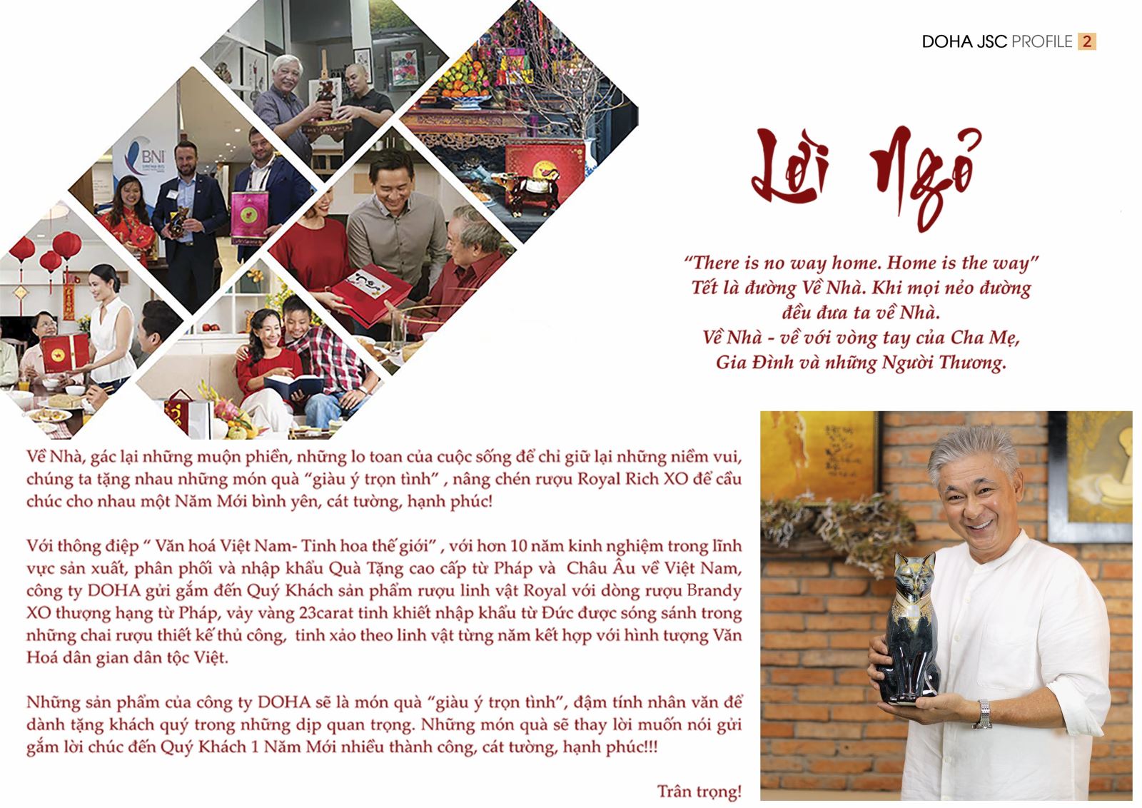 - Công ty Cổ phần đầu tư Doha ra mắt Catalogue với các sản phẩm quà tặng rượu linh vật mang nhiều thông điệp ý nghĩa trọn vẹn để đánh dấu những chặng đường với nhiều sự kiện trong một năm vừa qua và hân hoan cùng đón chào những sự kiện mới với nhiều thành công trong năm mới.