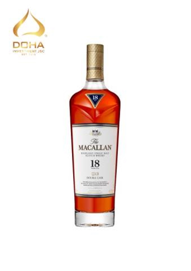 Rượu Macallan 18 YO, Double Cask, nằm trong series "The Macallan Double Cask", bao gồm Double Gold, Double 12Yo, Double 15Yo và Double 18Yo được ra mắt lần đầu vào năm 2018. Rượu whisky trưởng thành trong hai loại thùng khác nhau: thùng Sherry Oloroso thương hiệu của mình và sử dụng kết hợp các loại vỏ gỗ sồi theo mùa châu Âu và Mỹ, chính thức giới thiệu ra thị trường từ tháng 08/2020. Thích hợp dùng làm quà tặng, quà biếu.