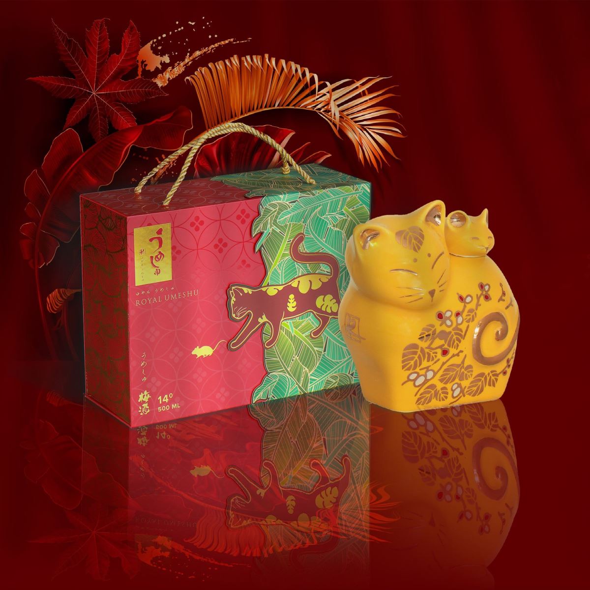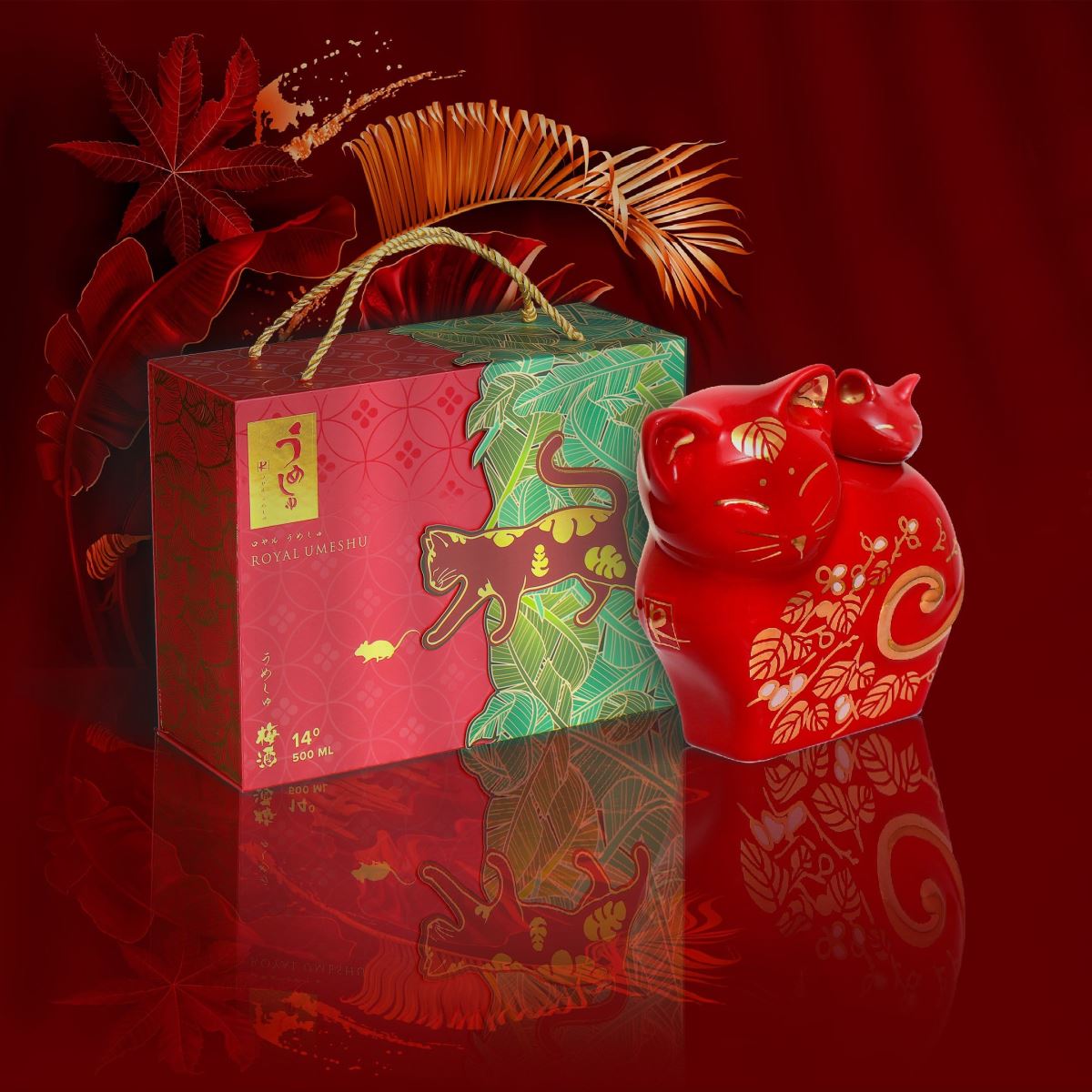 Royal Umeshu Gold 23K porcelain cat wine from DOHA house produced by Japanese technology has a light sweet taste combined with pure 23K gold flakes and is designed with a sophisticated Bat Trang ceramic bottle with the color symbol of apricot blossom and symbolic red. represents good luck on Tet.